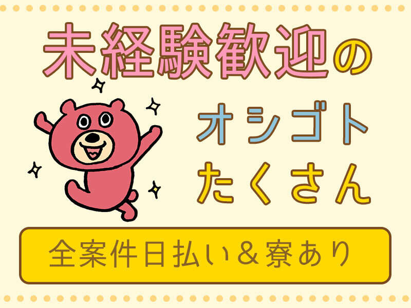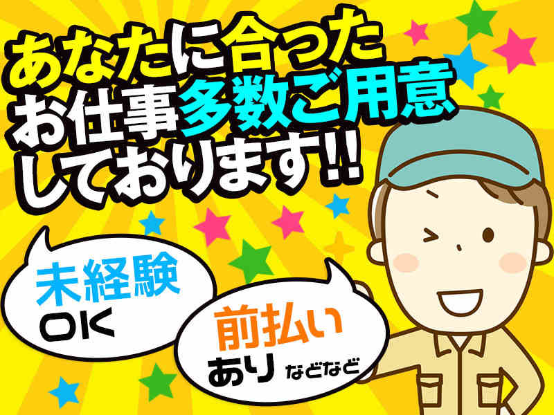 | 仕事内容 | ☆軽作業・シール貼り・検品・梱包・仕分け、他たくさんのお仕事☆ 未経験・経験者・フリーター・主婦さん・中高年の方・シニアの方、歓迎致します! ご希望のお仕事をご案内します! 専任の担当者がバックアップ オフィシャルサイトに掲載されていないお宝求人も多数あります! |